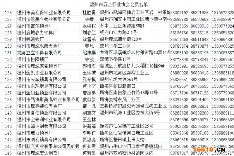 溫州市五金行業協會會員名單:包括單位名,負責人,地址,電話,傳真,手機號,郵編。全部242條數據。