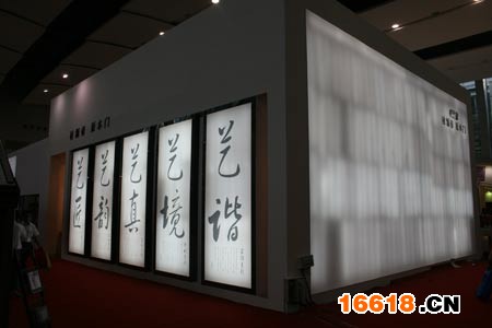 材源帝的展位采用白色作為主色調(diào),造型十分簡潔,背景墻上的五幅書法作品也因此顯得更為突出。材源帝采用這種間接的手段,反而更好的宣傳了企業(yè)的文化理念。