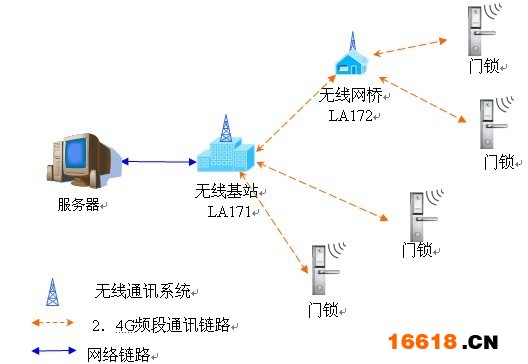 無線門鎖網絡組網原理:無線聯網門鎖系統的通信網絡分兩部分:無線通信網絡和有線通信網絡。門鎖與無線基站( LA171) 之間是通過無線信號進行通信的,無線基站( LA171)與管理軟件之間是通過有線以太局域網通信的。一般每個樓層可組成一個無線通信網絡。其中有一個無線基站( LA171),若干個無線網橋( LA172),及數量比較多的無線聯網門鎖(L5207-245等)。無線網絡是由無線基站( LA171)創建,無線網橋( LA172)和無線門鎖以就近原則自動路由加入。