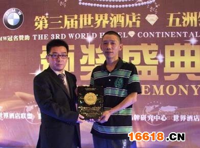 世界酒店聯(lián)盟創(chuàng)始人,兼執(zhí)行主席吳軍林先生給楊格鎖業(yè)總經(jīng)理?xiàng)罟儋F先生頒獎(jiǎng)