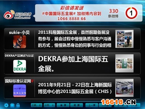 據中國國際五金展主辦方工作人員介紹,此次是中國國際五金展首次設立現場實時更新的微博互動平臺。“微博是目前全球范圍內最流行的互動交流方式,使用人數達數十億。我們在日常的工作之中也發現很多參展商與采購商也都在用微博,所以我們想到了把這種實時互動形式引入展會現場。”主辦方工作人員介紹,“此次,作為國內五金行業的“旗艦”展會,我們選擇了與國內微博領域的‘領頭羊’新浪微博合作,引入其成為展會獨家微博合作伙伴,并且在現場開辟了配備大屏幕,提供免費上網服務的休息區,給了現場觀眾全新的參觀體驗,也增加了現場參展商與觀眾的互動渠道,實現了更好的參展和參觀體驗。”