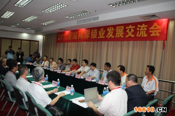 4月17日下午,由鎖博會組織的“2012首屆兩岸鎖業發展交流會” 在展館1號會議室如期召開。內地、臺灣鎖具界代表相聚一堂,共商兩岸鎖業合作、發展大計,此次會議是海峽兩岸鎖具行業舉辦的首次交流與溝通大會。全國制鎖行業信息中心主任趙宏武,中國制鎖行業專家委員會委員馬嘉瑤,廣東省五金制品協會秘書長鐘錦鏘,臺灣鎖業發展協會理事長何義輝、秘書長候佰良嘉賓及頂固、