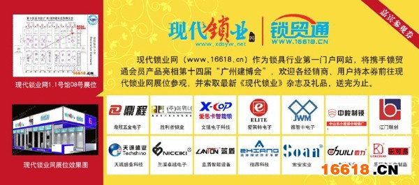 《現代鎖業》及鎖貿通網www.288yc.com作為鎖具行業第一門戶網站,將攜手15家鎖貿通會員強勢參展第十四屆“廣州建博會”,向參與展會的鎖界供應商、采購商、經銷商全面展示鎖貿通會員最新鎖具產品,集中展現品牌實力。歡迎參展廠商、用戶前往現代鎖業展位(A區1.1號館08號展位)參觀并索取最新《現代鎖業》雙月刊雜志和禮品,送完為止。