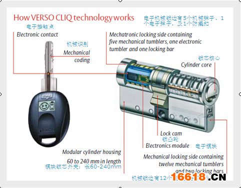 我們知道,商用等級的門鎖一般均可提供總鑰匙管理系統。但有些時候,若客戶會提出更為嚴格的安保需求時,如希望能得到每把鑰匙曾開啟過哪些門鎖的記錄?或是當某個重要的鑰匙遺失后,除了全部更換相關的鎖芯,是否還有其他更為方便和可靠的解決方案?或是在某些特殊的應用環境和條件下,無法進行排管布線等施工作業,如何解決電子門禁系統的統一管理等等。這樣,單純基于機械門鎖和鑰匙的總鑰匙系統,將無法滿足客戶的需要。同樣,來自ASSA ABLOY(亞薩合萊)Verso CLIQ的電子機械鑰匙及門鎖系統將會給用戶提供完美的解決方案。