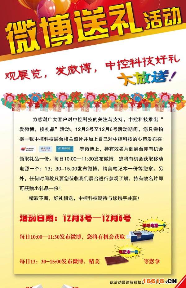 為感謝廣大客戶對中控科技的關注與支持,中控科技全新推出“發微博,換禮品”活動。12月3號至12月6號活動期間,您只需拍攝一張中控科技展臺相關照片并加上自己對中控科技的心聲發布在新浪、搜狐、騰訊等微博上,持有效名片到展臺即有機會領取禮品一份。每日10:00—11:30發布微博,您將有機會獲取移動電源一個;13:30-15:00發布微博,精美筆記本一份等您拿。另外,任何時間段只要您蒞臨我們展臺進行參觀了解,持有效名片即可獲贈小禮品一份!
