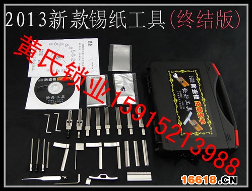 最新推出的2013款改良終極版錫紙工具上市了。錫紙工具在不斷的創新,每開發出一新一代的錫紙工具都會給人們帶來很多驚喜,更多的是自我超越,每一代錫紙工具的開發都使開鎖變得更加簡單方便,開鎖的時間用的更少。工具整體保留了四代錫紙套裝中半圓分體結構工具,工具箱中保留了歷代錫紙工具中開啟平板AB的3-2和4-2以及室內門窄口百利工具;主要更新修整了各類雙排珠工具,兩邊導針整合后更加方便快捷,拋棄以往雙排珠導針單獨抽拔難以控制前后定位的尷尬。手把也做了較大的修整,使得鎖匠在上門服務中以往大手把在開啟中磕碰到門框邊沿難以操作的弊病,在2013終極版中都有較大的改進.