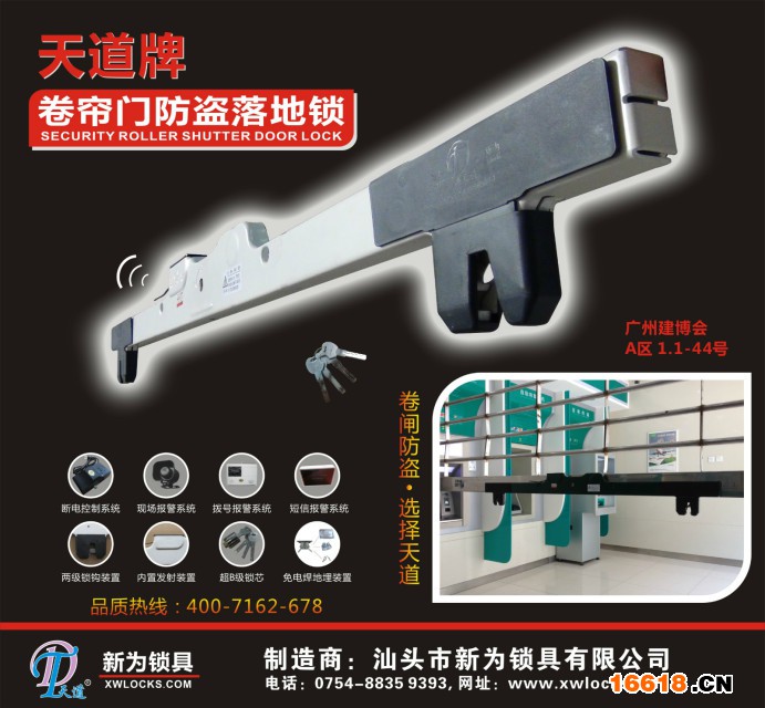 新為鎖具歷經多年對卷簾門防盜系列鎖具的專注研發及努力,產品已經遠銷世界20多個國家,近年來,國內多家專業銀行紛紛選擇我“天道牌卷簾門防盜落地鎖”作為營業網點ATM機隔離門及營業大廳卷簾門的防盜用鎖,因此,也成就了很多敢于第一個吃螃蟹并在機遇來臨時把握強度較高的一群人,具不完全統計,內銷3年來各地每年銷售及安裝本落地鎖賺100萬以上的人員不在少數,借此,預祝本次展會的順利召開,也期望更多的有識之士把握機會,加盟新為!贏在選擇,選擇比努力重要。