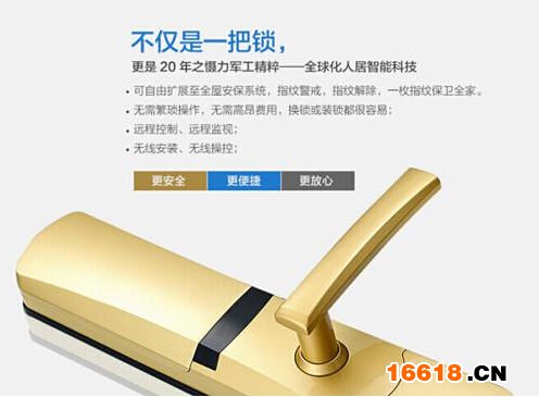 一種全新概念的智能鎖,融合了指紋鎖的智能,防盜報警器的安全,讓家門更加安全,除了主人,無人可以接近或者破解門鎖。第五種開鎖方式:手機遠程開鎖。不在現場也能為遠道而來的朋友開門,也能看到門鎖的情況,再也不用擔心孩子或者老人是否安全到家了。