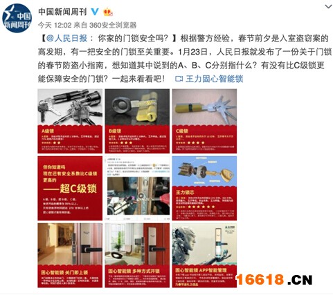 人民日報發布的鎖類科普受到其他權威媒體的關注,1月24日,以南方都市報、新周刊、中國新聞周刊為主的主流媒體發布微博并艾特人民日報,其實有比A、B、C級鎖芯安全系數更高的鎖,更能切實保障人身家庭安全。
