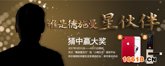 而這次“誰是德施曼星伙伴”明星大猜想活動,主要是德施曼智能鎖品牌將在4月份與一位明星成功合作而舉行的一場全民猜測贏大獎的活動。聽說此次獎品有最新的紅色iphone7和德施曼品牌智能鎖一套,此次活動將會在德施曼官方微信、微博等媒體平臺同時開展。