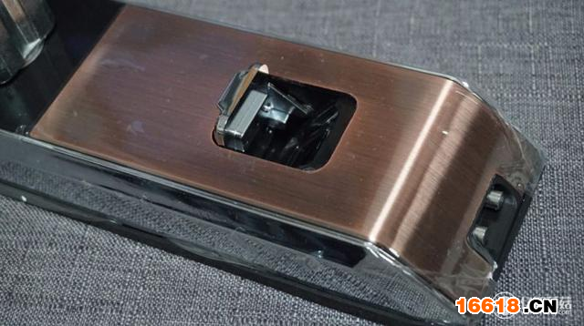 接著往下看,這里就是智能鎖的精髓所在了,指紋識別區域,采用光學傳感技術識別,使用壽命長,穩定性,耐用性和抗破壞性都顯著增強,嗯,還是沒通電,先這么看看吧,前面板底部兩個小啾啾,是應急電源接口,稍微會說到。
