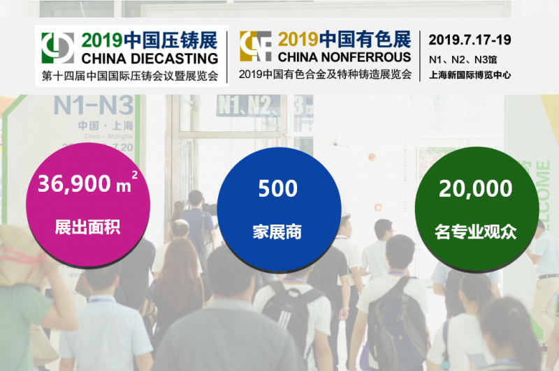 作為中國壓鑄及有色鑄造行業(yè)盛會,自1997年舉辦的CHINA DIECASTING中國壓鑄展(www.diecastexpo.cn),和自2016年起同期舉辦CHINA NONFERROUS中國有色展(www.cnf-ex.com)將于2019年7月17-19日在上海新國際博覽中心N1-N3館(SNIEC)舉行。