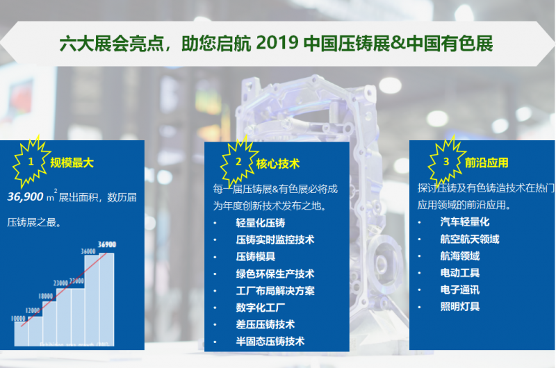 2019年預(yù)計近100家壓鑄企業(yè)將展出先進的鋁鎂鋅壓鑄件,70余家壓鑄廠將在展會品牌活動“全球優(yōu)質(zhì)壓鑄件評選及有色鑄件展示”上,展出140余件來自汽車、電子通訊、機電儀表、建筑五金、電動工具等應(yīng)用領(lǐng)域鑄件。應(yīng)用領(lǐng)域的采購商、質(zhì)量工程師、研發(fā)工程師云集展會,與壓鑄廠及有色鑄造廠共同探討輕量化、電動汽車、3C產(chǎn)品、5G基站等熱點發(fā)展趨勢。