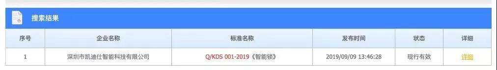 此次通過智能門鎖企業標準“領跑者”評估的產品型號S8,是凱迪仕于2018年推出的一款把手款智能鎖。包括S8在內,凱迪仕所有把手款智能鎖均按照企業標準執行,標準號為Q/KDS 001-2019, 該標準在企業標準信息公共服務平臺發布。