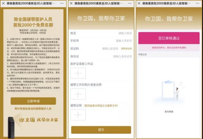 陽春三月,英雄歸來。為了能以實際行動感恩馳援“疫”線的全國援鄂醫護人員,德施曼主動作為,特發起“你衛國,我幫你衛家”公益行動。基于疫情對企業各方面的影響,加上企業對自身能力的考量后,德施曼針對有智能鎖需求的援鄂醫護人員,首批將免費贈送2000套新品3D人臉智能鎖R7,1年之內均可有效領取,下單后一個月內陸續完成發貨,同時享受免費安裝待遇。
