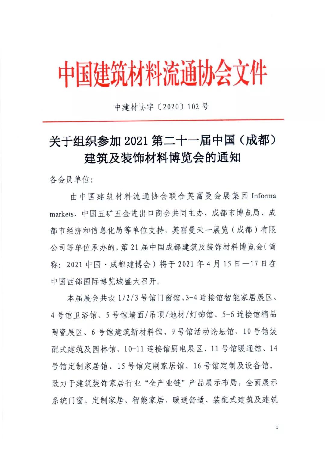 第二十一屆中國(成都)建筑及裝飾材料博覽會(簡稱:中國·成都建博會/CCBD)將于2021年4月15-17日,在成都·中國西部國際博覽城隆重舉行,繼續為中西部地區大家居建裝行業提供高效、務實、便捷的商貿平臺。