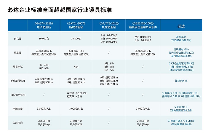 28年來初心不改,必達堅持匠心打造每一款產品,并嚴格參照歐美認證標準去設計、生產和制造,其主要智能鎖產品均通過中國公安部 GA 標準認證、美國 BHMA 電子鎖認證、美國 UL 防火安全認證、歐洲 CE 電子鎖認證等權威標準認證。值得一提的是,必達還是國家最新智能鎖行業標準《GA 374-2019》的標準起草單位。依托豐富的行業經驗,以及深厚的研發實力,必達積極做好行業標桿品牌的角色,推動智能鎖行業往良好健康的方向發展。
