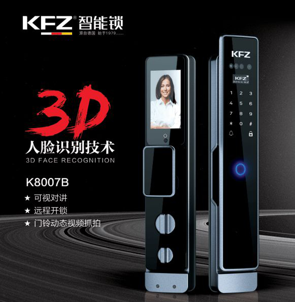 KFZ智能鎖新推出的K8007B是一款集門鈴、貓眼、智能鎖與一身的3D人臉視頻鎖,擁有3D人臉識別、視頻對講及諸多個性化功能。