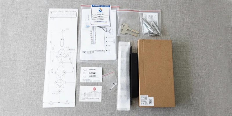 打開產(chǎn)品包裝,能看到第一層放置的是配件及紙質(zhì)資料。內(nèi)部采用硬紙板進行固定,配件均有獨立的包裝。該層主要有開孔圖、產(chǎn)品說明書、檢驗證書、機械鑰匙、鎖體及螺絲包等。