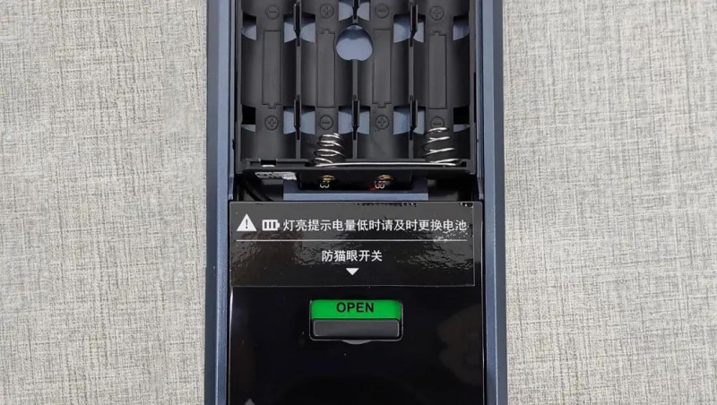 前面板從上至下分別是干電池倉、防貓眼開關、快開把手。