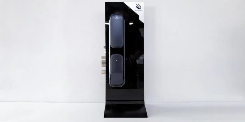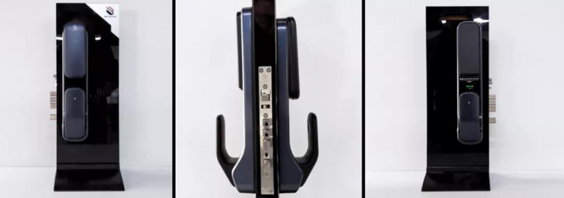 必達T2前面板從上至下分別是燈光提示及刷卡區(qū)、隱藏式按鍵區(qū)、指紋頭,把手為推拉式。