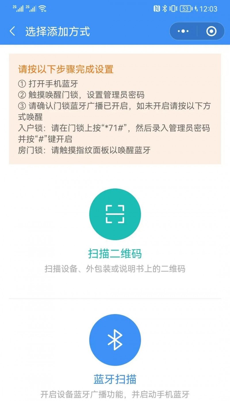 注冊完成后則會進入小程序界面,此時需要點擊添加設備,將門鎖與手機綁定。