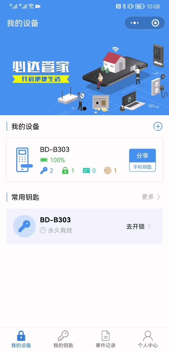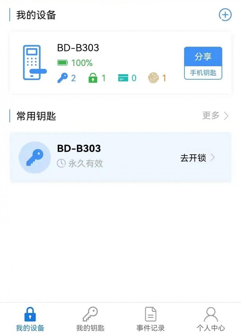 綁定小程序后,在主界面【我的設備】欄,可以查看門鎖當前狀態(tài),包括電量、鑰匙、密碼、卡片、指紋數(shù)量。