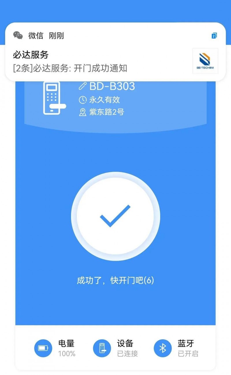 當通過藍牙開鎖成功后,手機還會接收到開鎖通知。(需關注“必達服務”公眾號綁定)