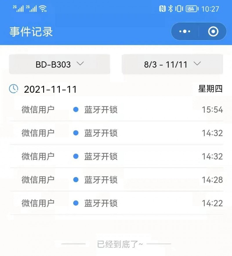 通過必達智慧管家小程序,還能實時接收門鎖信息記錄,包括開鎖、預警等記錄,并可自由選擇查看時間跨度。