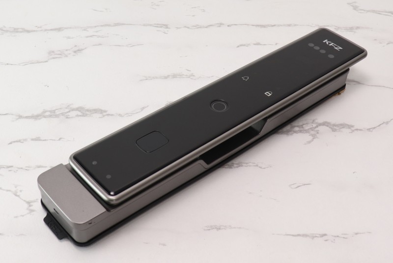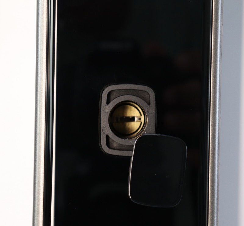 指紋識別傳感器下方為鎖芯保護蓋,掀開后可看見鎖芯,可以看得出K8007B采用真插芯結(jié)構(gòu),安全性更強。
