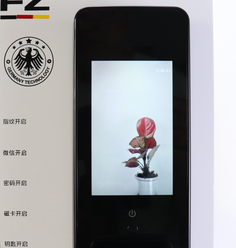 3D人臉識別及可視攝像頭下方為液晶顯示屏及數(shù)字鍵盤,鍵盤還有門鈴功能按鈕及一鍵上鎖按鈕。