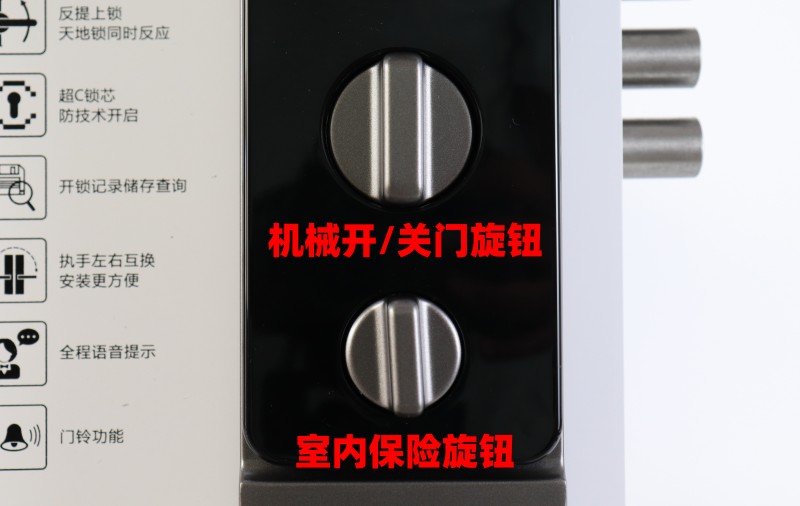 游離把手下方分別為機械開/關(guān)門旋鈕及室內(nèi)保險旋鈕。portant; overflow-wrap: break-word !important;">機械開/關(guān)門旋鈕同樣可以實現(xiàn)解鎖及上鎖,而室內(nèi)保險旋鈕主要起到反鎖功能,反鎖之后從室外任何方式均無法開啟,給夜深入眠之后的家人帶來更安全的環(huán)境。