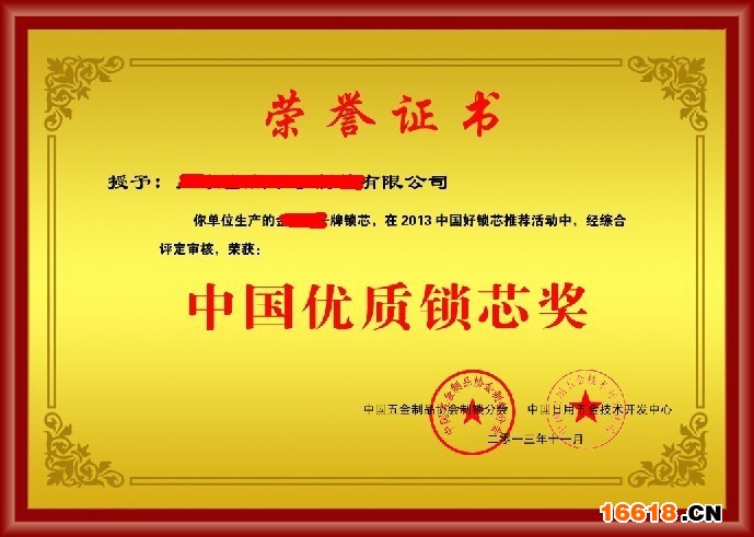 中國鎖芯十強及十佳證書樣子