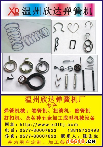 溫州欣達彈簧機廠系為生產各種精密彈簧機械設備、五金加工成型機械的專業廠家。主要產品有:自動卷簧機,自動扭簧機、壓簧機,繞簧機、雙端面磨簧機、彈簧磨頭機、雙扭簧機、打扣機,成型機,卷圓機,打圈機、高鐵軌枕螺旋筋彈簧機,地鐵軌枕螺旋筋彈簧機、護套彈簧機及各種五金成型機械!該廠創辦以來,我們始終以科技為發展導向、完善的科學管理體系、雄厚的技術力量,相繼開發出一系列具有國際先進水平的彈簧機械、五金成型設備。廣泛應用于機械制造,五金加工行業,電子電工,工礦企業,鐵路公路建設,摩托汽配,鎖具、玩具,辦公等各個領域。公司擁有一支高素質的專業生產隊伍,具備豐富的設計制造經驗。