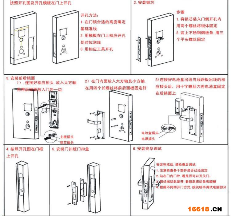 ◆注意:由于鎖的款式不一樣,所以開孔尺寸上有偏差,或樣式不一樣,不過我們隨貨都有專門的開門圖紙模板,方便客戶給門開孔!此安裝圖示為了方便客戶自行安裝調試,描述詳細,步驟清楚。此圖示是拿HAX-3000A款酒店門鎖來做示范,雖款式不一樣,不過萬變不離其中,其他款式智能鎖,電子鎖的安裝方式皆可按此步驟來執行!