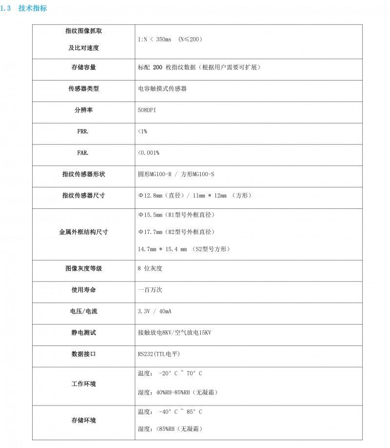 指紋圖像抓取及比對速度:1 : N < 350ms (N≤200)