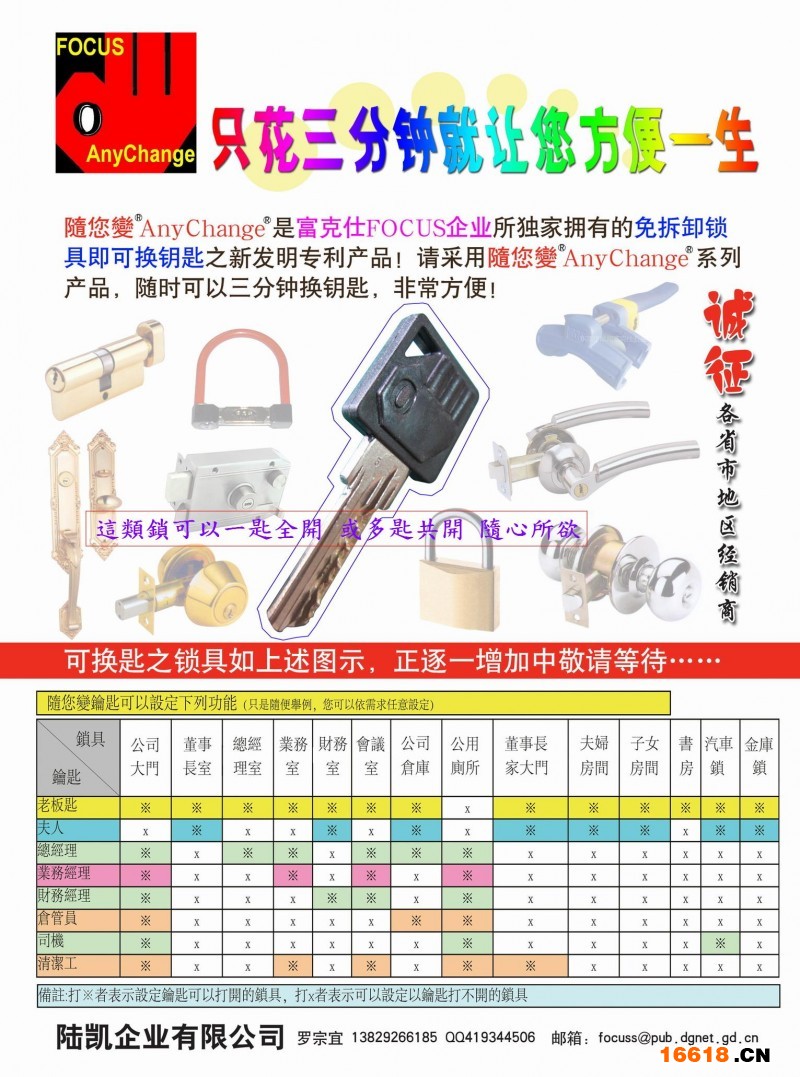 您可以將公司辦公室大門抽屜汽車防盜鎖自家大門夫妻臥室子女臥房書房等等的鎖具三分鐘/每把鎖無需卸鎖換成一匙全開相關(guān)上述之鎖亦可以配成多匙共開 - 如同使用指紋鎖(機(jī)械式)一般至為方便